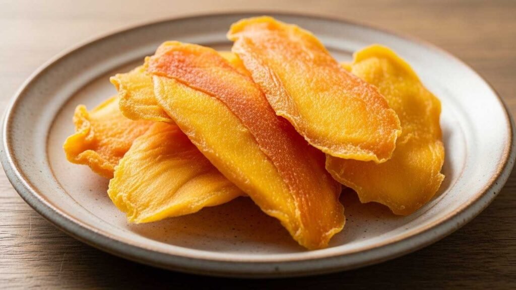 A handful of dried mango slices arranged on a small ceramic plate, showing their bright orange color and slightly glossy texture. The lighting enhances the natural sweetness and highlights the gently curled edges of each slice. The setup feels tropical, simple, and inviting.